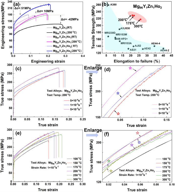 Dislocation strengthening, as one of the methods to simultaneously enhance the room temperature strength and ductility of alloys, does not achieve the desired strengthening and plasticity effect during elevated-temperature deformation. Here, we report a novel strategy to boost the dislocation multiplication and accumulation during deformation at elevated temperatures through dynamic strain aging (DSA). With the introduction of the rare-earth element Ho in Mg-Y-Zn alloy, Ho atoms diffuse toward dislocations during deformation at elevated temperatures, provoking the DSA effect, which increases the dislocation density significantly via the interactions of mobile dislocations and Ho atoms. The resulting alloy achieves a great enhancement of dislocation hardening and obtains the dual benefits of high strength and good ductility simultaneously at high homologous temperatures. The present work provides an effective strategy to enhancing the strength and ductility for elevated-temperature materials.