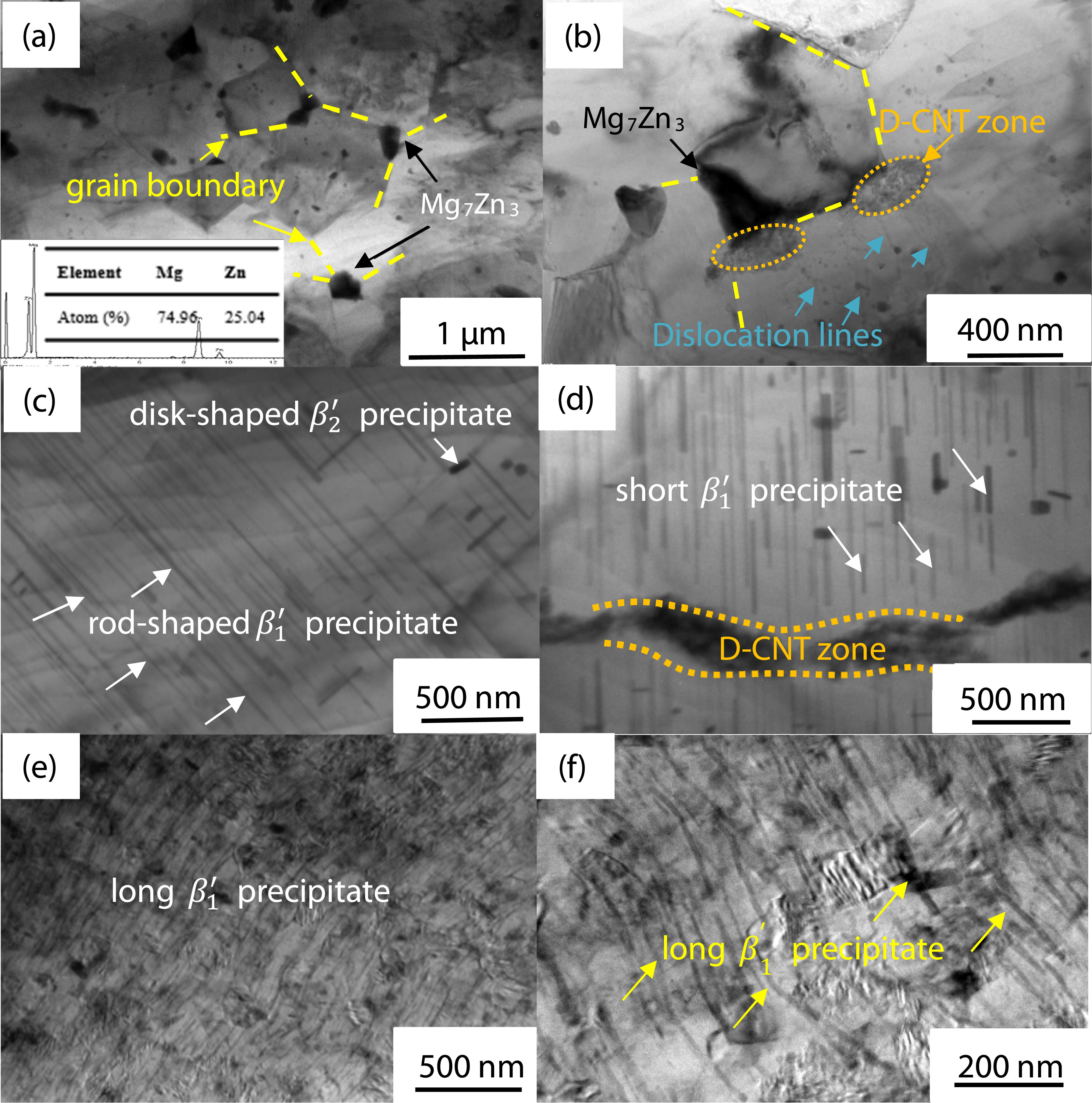 as-aged ZK61/0.6 wt.% D-CNT composite achieved an excellent thermal conductivity of 166 W/(mK), exhibiting 52.3% enhancement in comparison with matrix, as well as tensile yield strength of 321 MPa, ultimate tensile strength of 354 of MPa, and elongation of 14%. The simultaneously enhanced thermal conductivity and